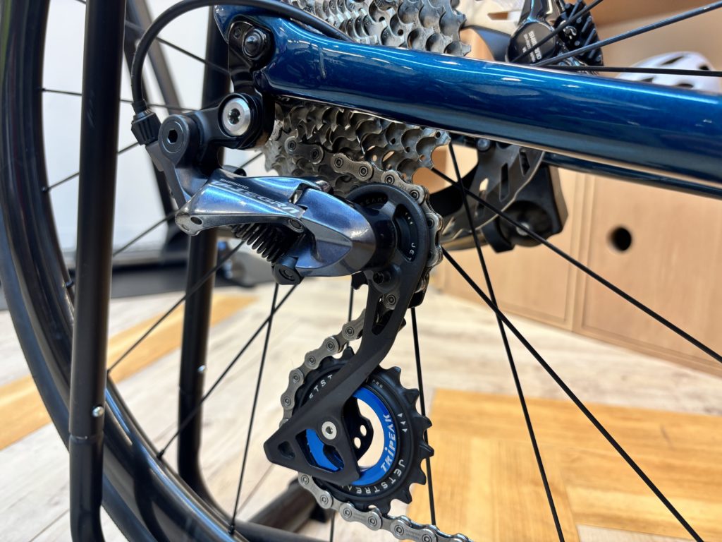 リアディレイラーには変速性能や軽量化を重視して「ULTEGRA R8000」のリアディレイラーを選択、更にペダリングをより快適にする為にPlus1bicyclesで人気の「TRiPEAK JETSTREAM PRO2プーリーキット」をインストール!