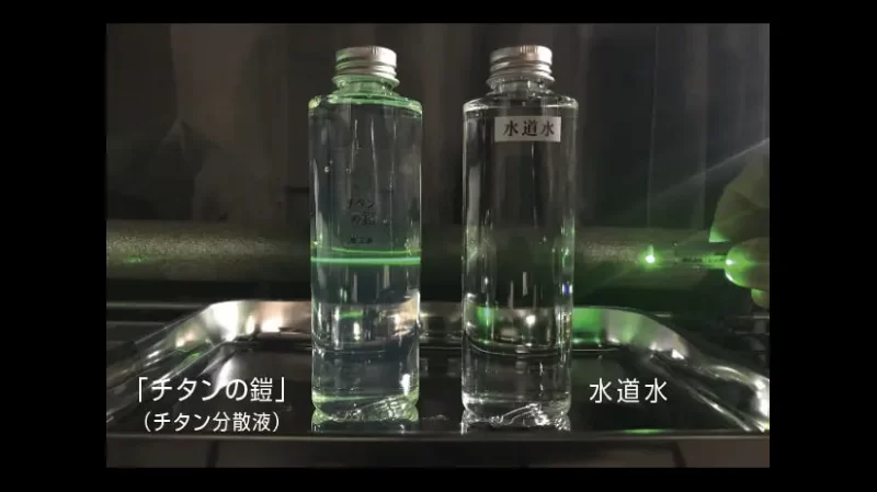 レーザー光線を当てると「チタンの鎧」(チタン分散液)はレイリー散乱という現象が生じ光線がハッキリと見えます。これは溶液中に分散しているナノチタン粒子にレーザー光が反射している事による現象で確かにナノ粒子が分散していることが分ります。 因みにチタン分散液中に分散しているナノ粒子の量は1mlあたり約1京個(1000000000000個)もの粒子が存在しますが、粒子があまりにも小さいため肉眼では透明に見えるのです。 宇宙の素粒子研究の分野で日本は世界トップクラスですが、その技術から生まれたシングルナノチタンは現在のナノテク技術でも世界一と言えます。