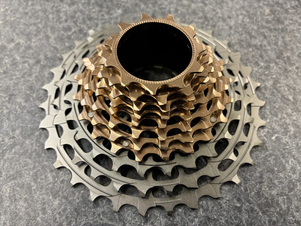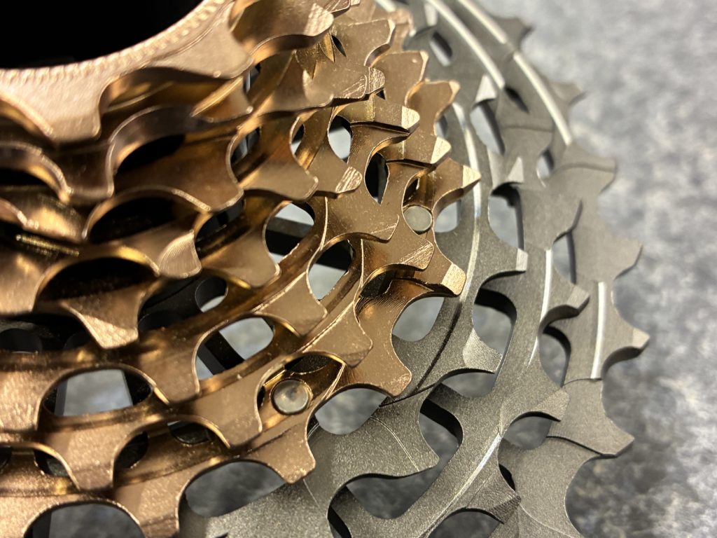 | 11S MTB⽤/HG 価格:2万6400円 サイズ:11-46T(310g) カラー:チタニウムゴールド ※ロー側1枚のみアルミニウム製 | 12S MTB⽤/HG 価格:2万8600円 サイズ:11-50T(286g) カラー:チタニウムゴールド |