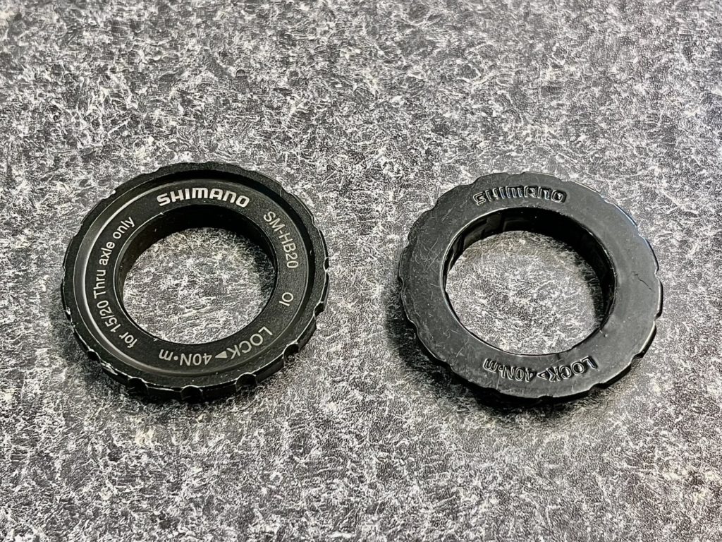 シマノのOUTタイプのロックリング、Y26L98030(厚約3.9mm)やY8JX98020(厚約2.3mm)の方が外形的には大きいですが、シルバーのワッシャーの径は約40mmなのでINタイプとも変わりはありません。