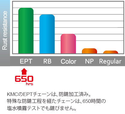 EPT技術により、チェーンは通常の物より耐久性が高く、耐摩耗性も高くなっています。