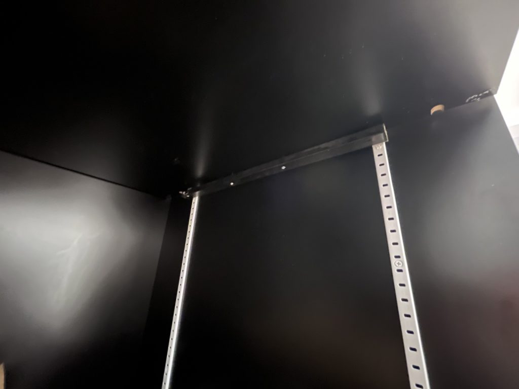 他の場所よりも内幅が広いので棚板が小さく、片側に寄せると棚がフックの端3mmしかかからないので角材で挟んで終了!