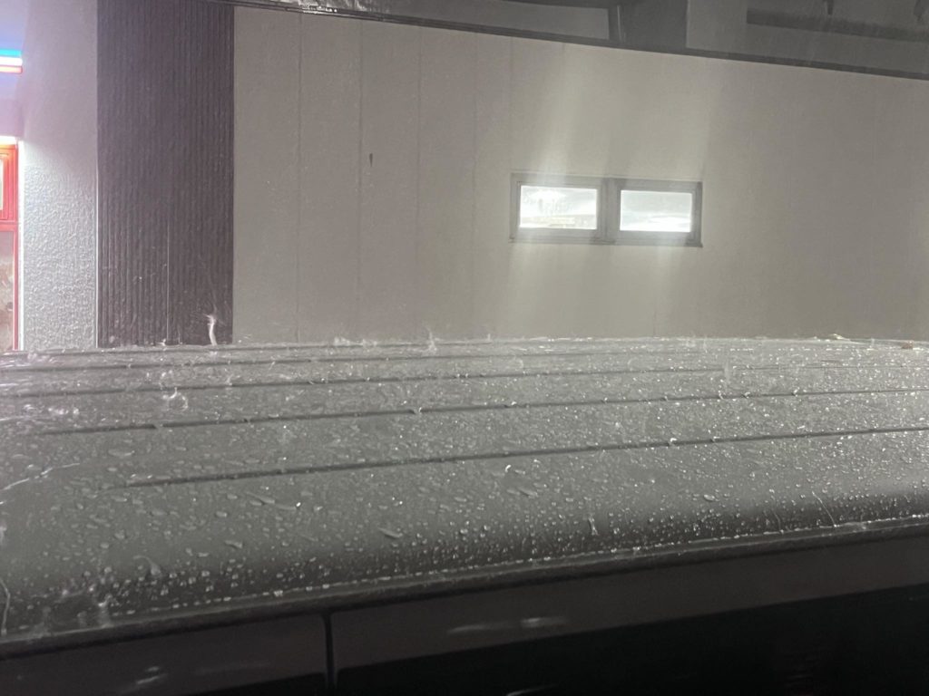 天井に打ち付ける雨水の跳ね上がり方が、ぴょんぴょんなので強さが分かってもらえるかと思います。