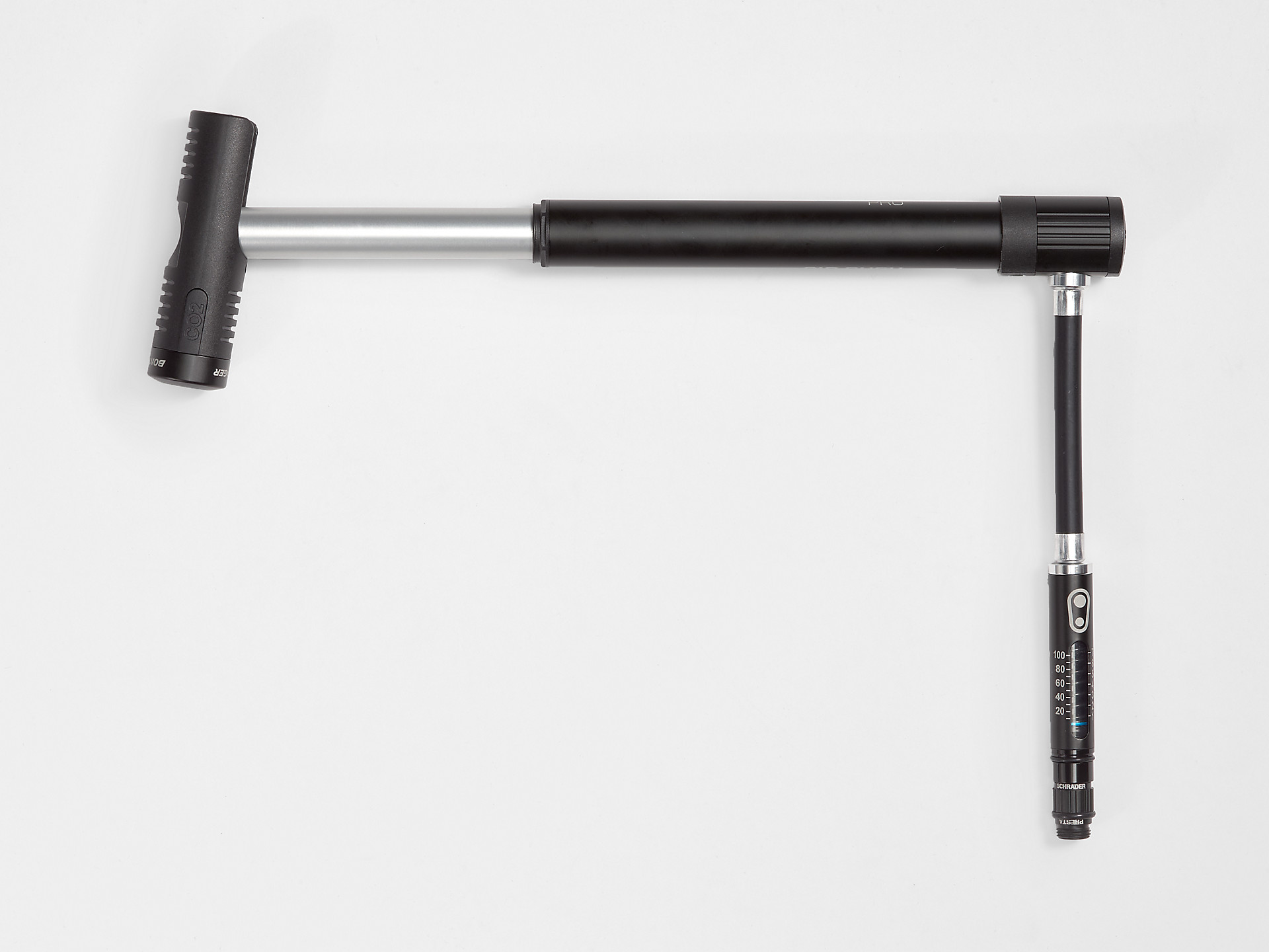 高圧対応のポンプなので、最大エア圧まで手で入れる事が可能です。 ポンプストロークも長いので手だけも十分にエアを入れる事が出来ますが、 ハンドル内に収納されたインフレーターを使うことでCO2も使用可です。 ブラケットが付属していますので、フレームへの取り付けもできます。 プレッシャーゲージも付いています。